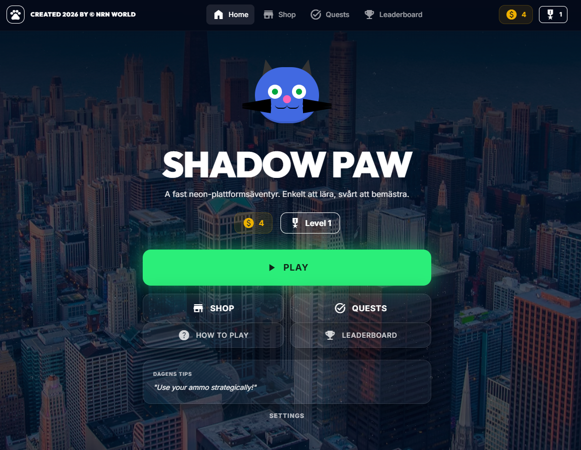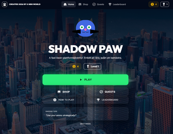 Welcome to the Neon City! In Shadow Paw, you take on the role of a swift cyber-cat on a high-stakes mission across the city rooftops. Using your lightning-fast reflexes, you'll need to run, double-jump over treacherous pitfalls, collect fish (your currency!), and survive incoming enemies.